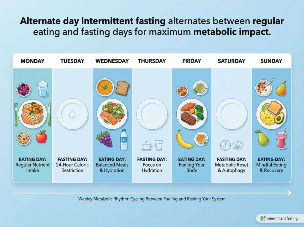 With this approach, you alternate between regular eating days and fasting days throughout the week in a consistent pattern. On fasting days, you either consume zero calories (complete fast) or limit intake to about 500 calories maximum.