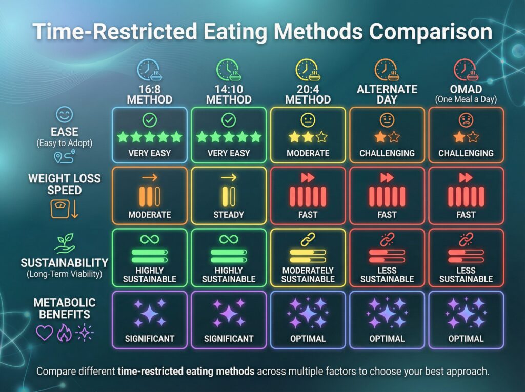 Now that we’ve explored each intermittent fasting method individually, lets look at how they actually stack up against each other across the key factors that matter most.